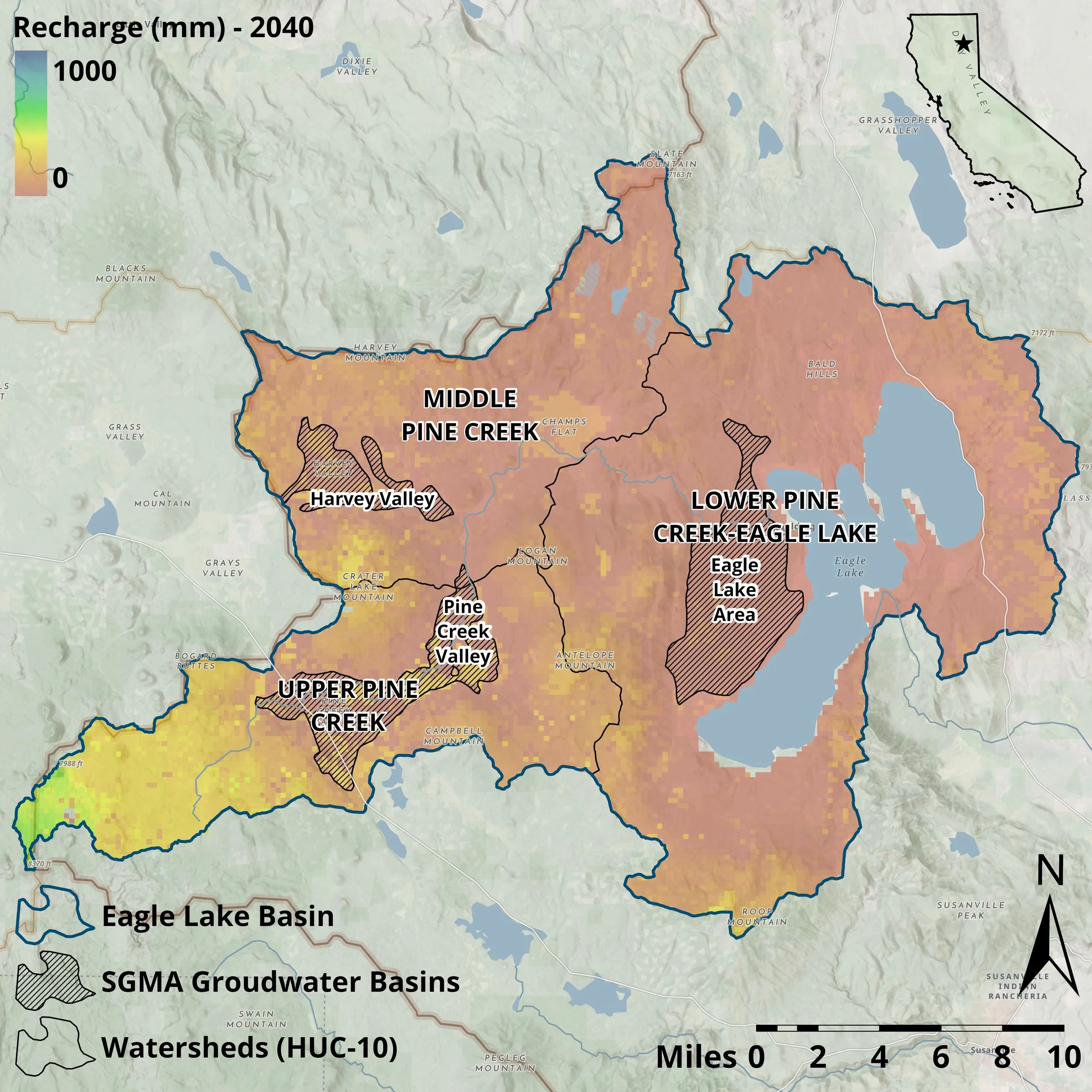 Mean Annual Recharge (mm) for the water year 2040 for the watersheds of the Eagle Lake Basin.