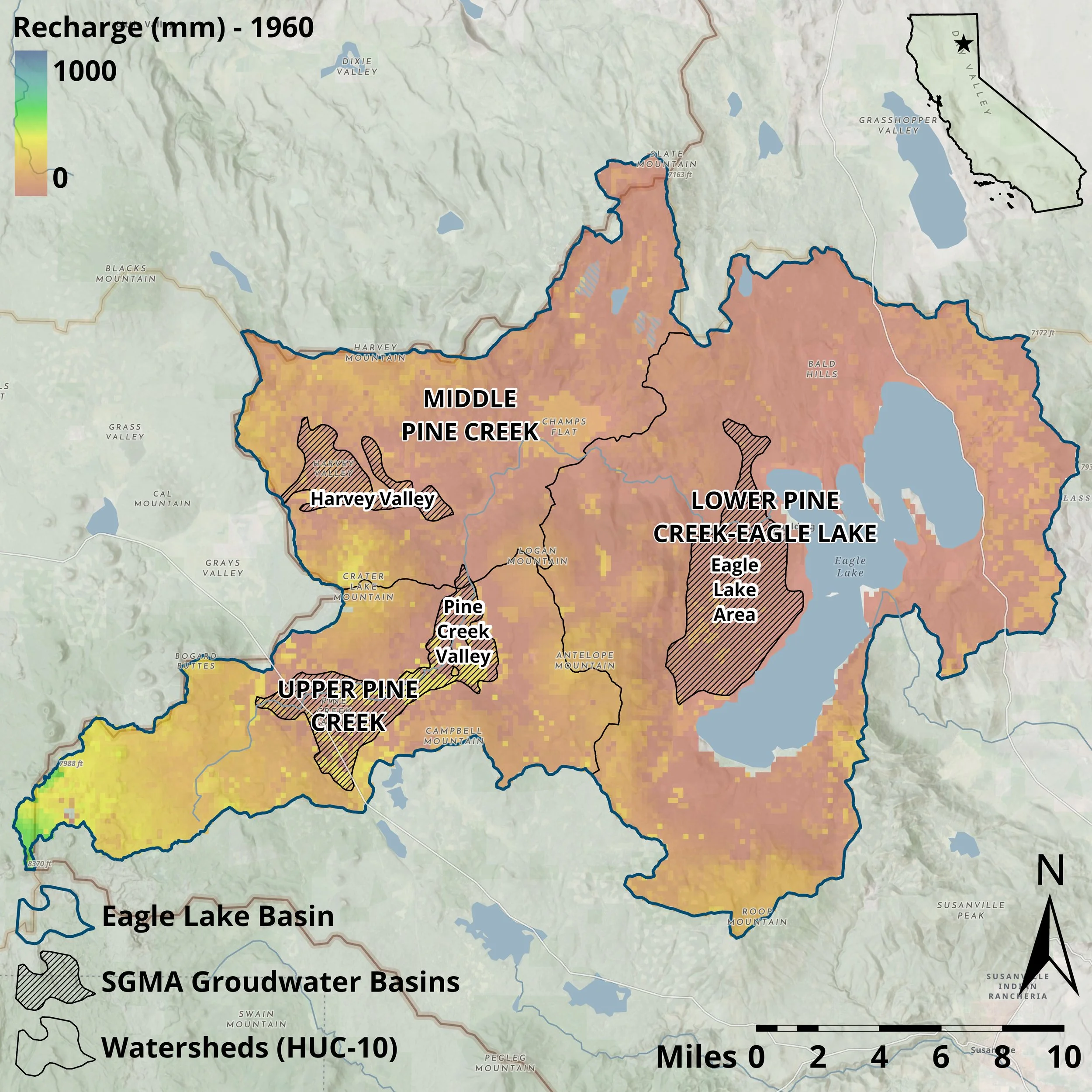 Mean Annual Recharge (mm) for the water year 1960 for the watersheds of the Eagle Lake Basin.