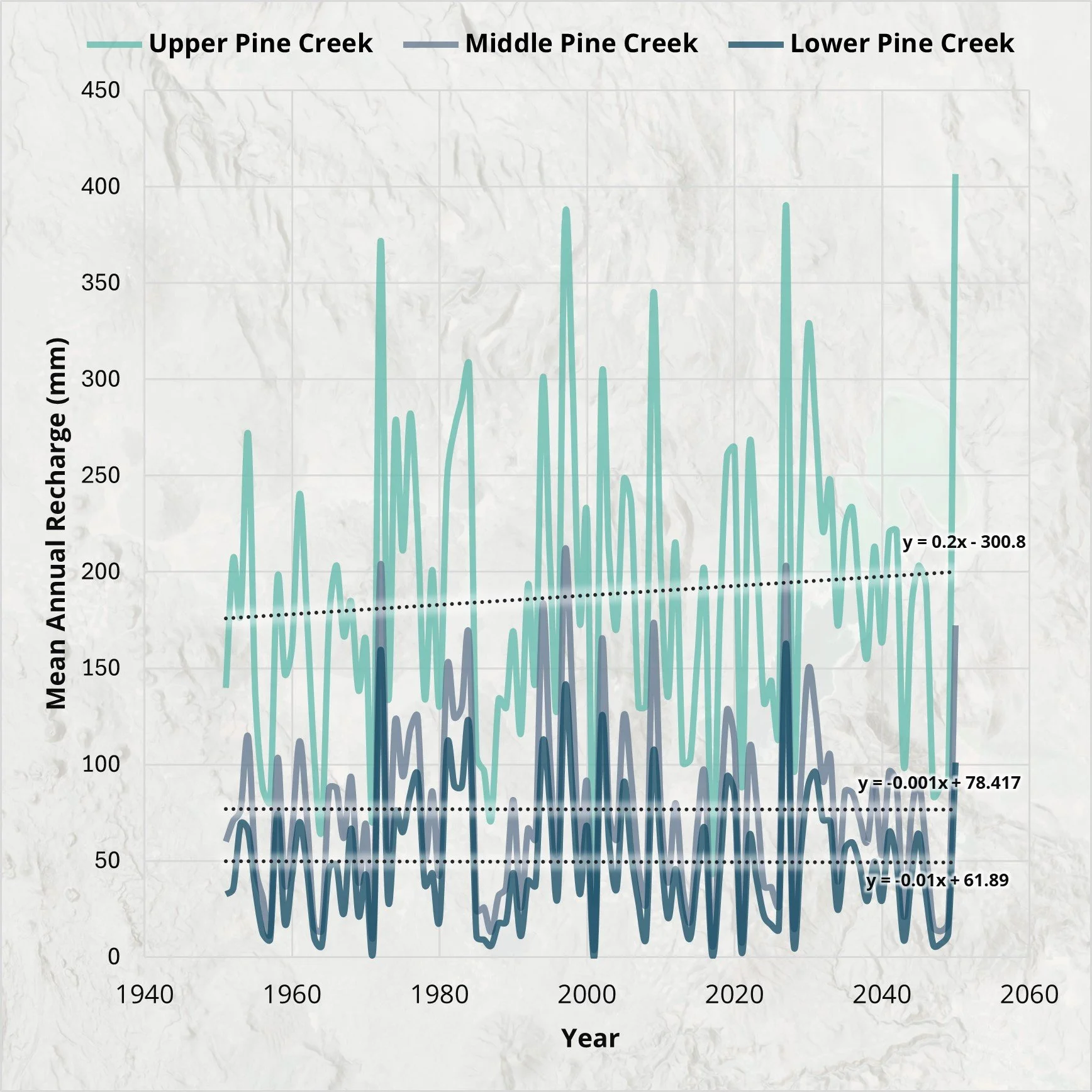 Using the BCMv8 model and LOCA-downscaled climate projections (RCP 4.5 scenario), we simulated potential changes in groundwater recharge through the mid-21st century.